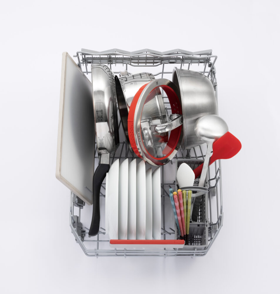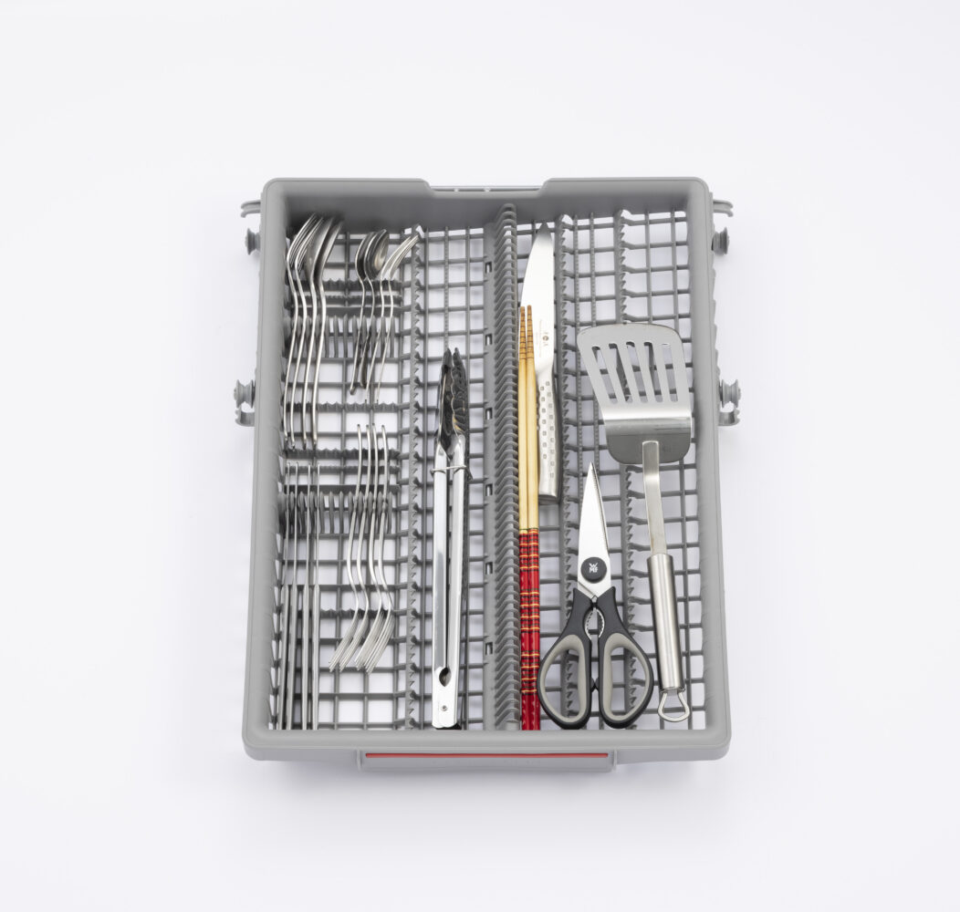 深さのある鍋や高さの異なる食器をバスケットに並べてまとめて一度に洗うことができます。